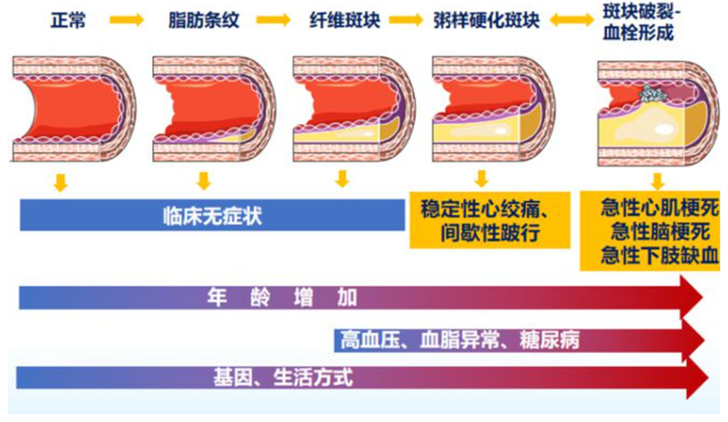 在年齡、吸煙、飲酒、高血壓、糖尿病、血脂異常等多種危險(xiǎn)因素的影響下,正常的動(dòng)脈血管壁上出現(xiàn)動(dòng)脈粥樣硬化斑塊。