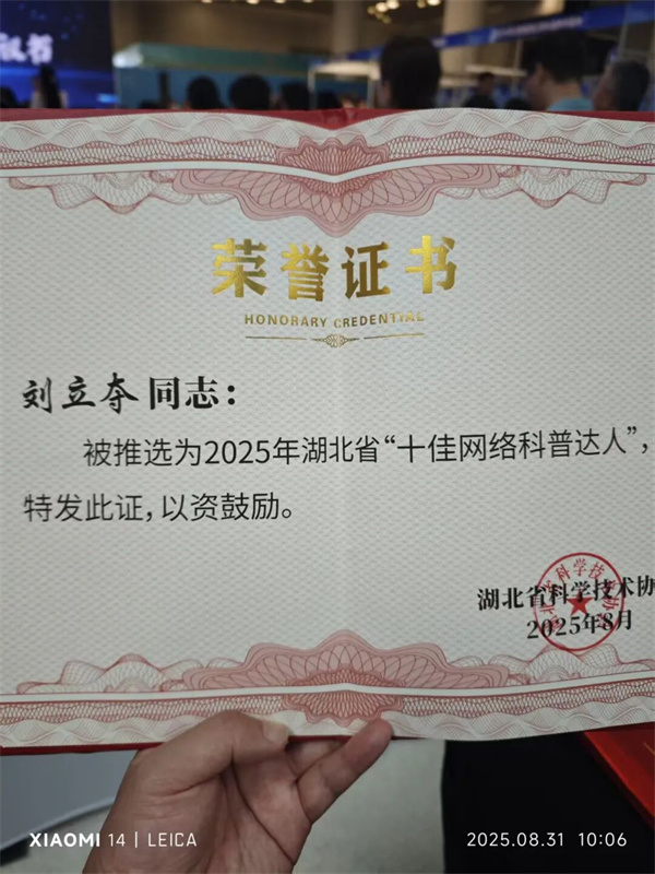 8月31日,省科協(xié)發(fā)布《省科協(xié)關(guān)于2025年湖北省“十佳網(wǎng)絡(luò)科普達(dá)人”推選結(jié)果的通報(bào)》,荊門市中醫(yī)醫(yī)院劉立奪主任榮獲2025年度湖北省“十佳網(wǎng)絡(luò)科普達(dá)人”稱號(hào)。