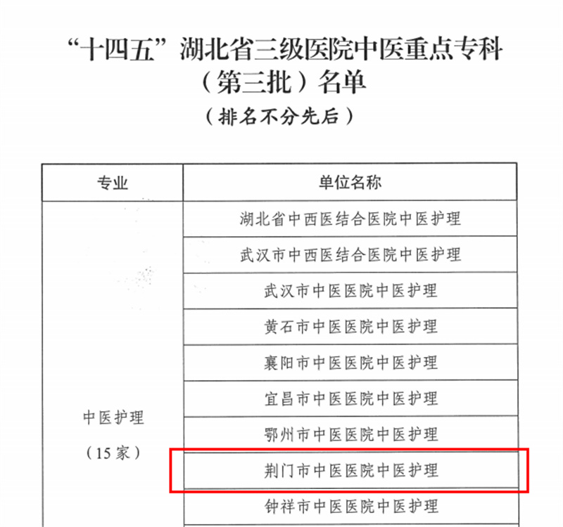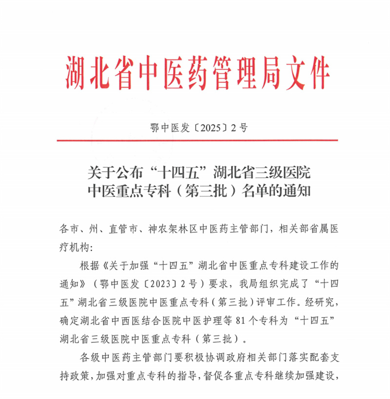 10月9日,湖北省中醫(yī)藥管理局公布 “十四五” 期間湖北省三級醫(yī)院中醫(yī)重點??疲ǖ谌┰u審結(jié)果。其中,荊門市中醫(yī)醫(yī)院的中醫(yī)護理、臨床藥學(xué)、急診科、耳鼻咽喉科、眼科五大??票憩F(xiàn)突出,憑借扎實的專業(yè)根基、鮮明的中醫(yī)藥特色及顯著的臨床療效,成功獲評省級中醫(yī)重點???。